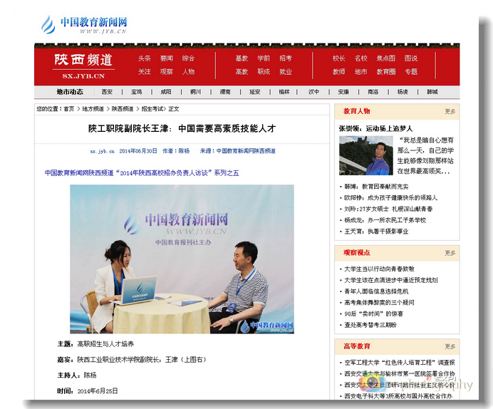 6月25日,在参加陕西省第四届高等教育博览会暨招生咨询会期间,副院长王津围绕“高职招生与人才培养”接受了中国教育星空(中国)网记者历时近一小时的专访,现将全文转载如下: 陕工职院副院长王津:中国需要高素质技能人...