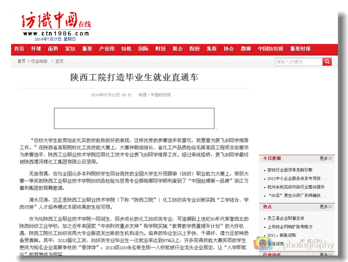 7月23日,《中国纺织报》以《工学结合、学岗对接,陕西工院打造毕业生就业直通车》为题聚焦我院化工纺织专业人才培养。